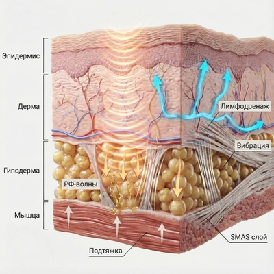 Целлюлит — это «капкан» для жировых клеток. Разросшаяся фиброзная ткань (перемычки) намертво припаивает кожу к мышцам, а отек раздувает ткани изнутри. Получается эффект стеганого одеяла. Кремы работают только на поверхности эпидермиса (глубина 0.1 мм), а проблема залегает в гиподерме и глубоких слоях дермы (глубина 1.5–13 мм). Туда, где лежит корень проблемы, способны достать только сфокусированная энергия аппарата и глубокая механическая проработка. Самостоятельно «разбить» фиброз или сократить растянутую кожу невозможно.