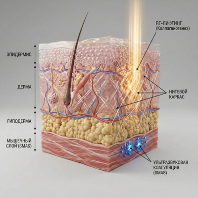 Решение этой задачи лежит не в плоскости ухода, а в плоскости терапевтической косметологии. Чтобы открыть взгляд, необходимо воздействовать на «архитектуру» века — глубокие слои дермы и связочный аппарат, куда способны проникнуть только энергия аппаратов, нити или инъекции.