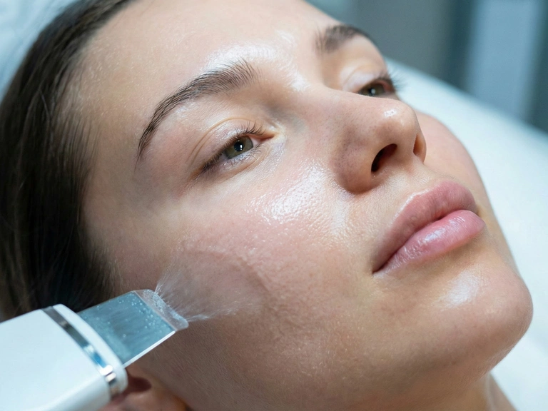 ● Газожидкостный пилинг работает как бесконтактная шлифовка: мощная струя физраствора и кислорода буквально «сдувает» тусклый слой эпидермиса и одновременно массирует ткани, разгоняя лимфу.