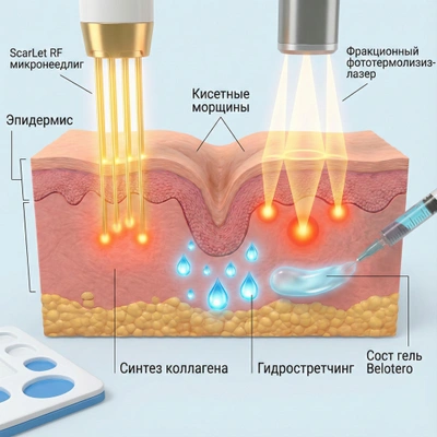 Кремы работают только на уровне эпидермиса (верхнего слоя), лишь временно смягчая поверхность. Истинная проблема — деградация коллагенового каркаса и дефицит гиалуроновой кислоты — залегает в глубокой дерме. Чтобы «вытолкнуть» морщину, нужно либо доставить туда влагу иглой, либо спровоцировать мощный внутренний ремонт тканей с помощью энергии лазера или радиоволны.