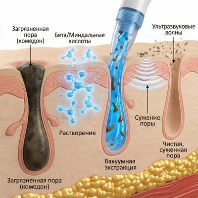 Почему это происходит? Дело в том, что обычное умывание и домашние пилинги работают только с самой поверхностью эпидермиса. Но корень проблемы — сальная пробка и ороговевшие чешуйки — залегают глубоко в устье поры, куда не достанет ни один крем. Пытаясь выдавить их самостоятельно, вы лишь травмируете сосуды, но не очищаете пору до дна.