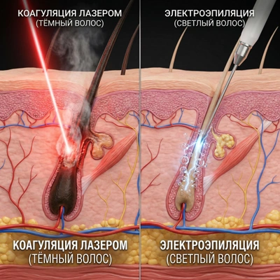 Для светлого пушка, седых или рыжих волосков, в которых нет пигмента (и которые лазер «не видит»), мы используем электроэпиляцию. Это единственный в мире метод, признанный «удалением навсегда» для любого типа волос. Врач вводит стерильный микро-электрод (тоньше человеческого волоса) в естественное устье фолликула. Мы не прокалываем кожу, а скользим вдоль канала. На глубине происходит точечная подача импульса, который полностью разрушает ростровую зону (стволовые клетки волоса). Фолликул зарастает соединительной тканью и больше никогда не сможет произвести волос.