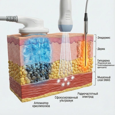 Наша задача — не просто «сжечь» жир, а сократить площадь тканей так, чтобы живот стал плоским. Для этого мы применяем протокол «слоеного пирога», работая на всех уровнях глубины.